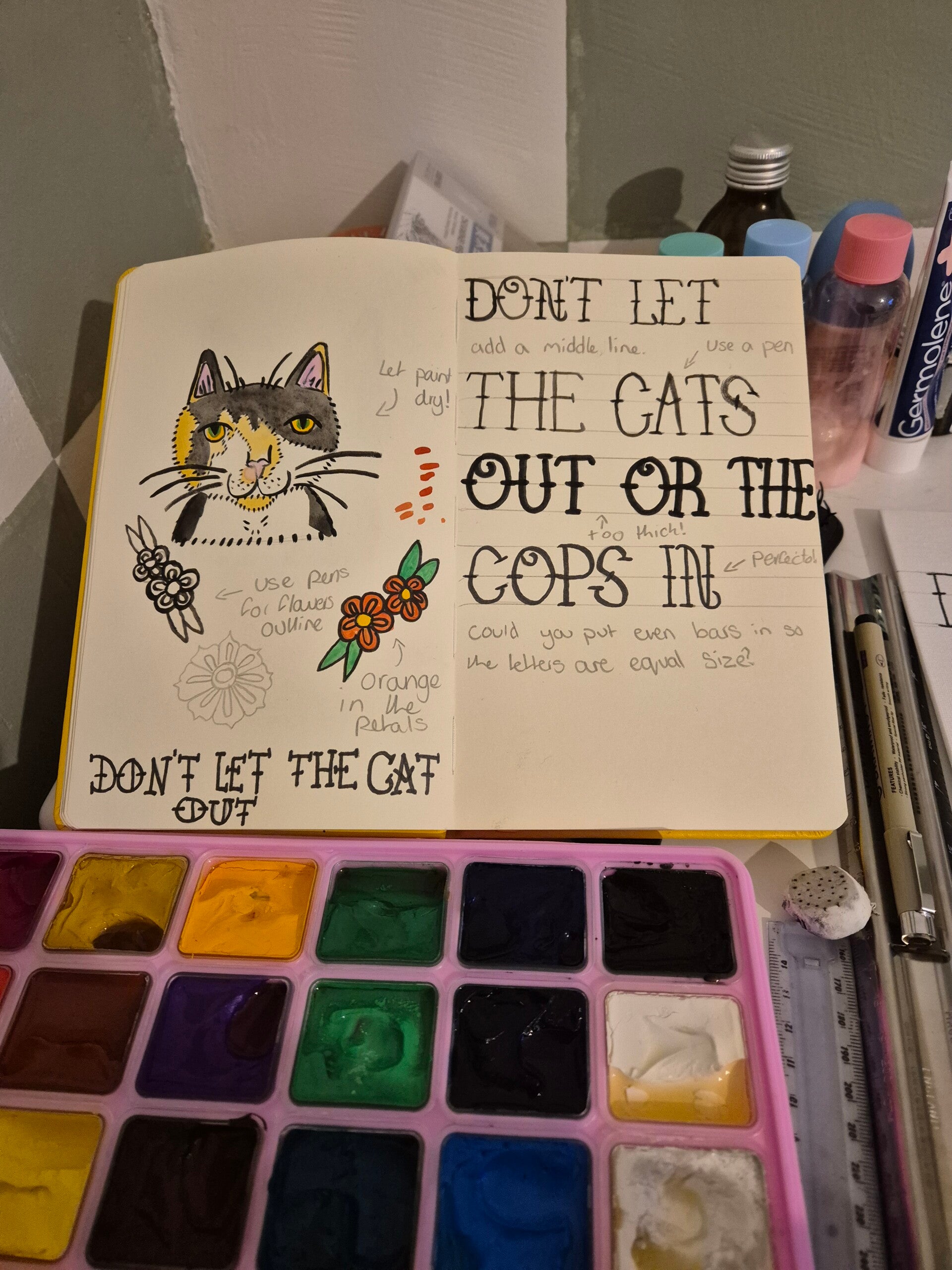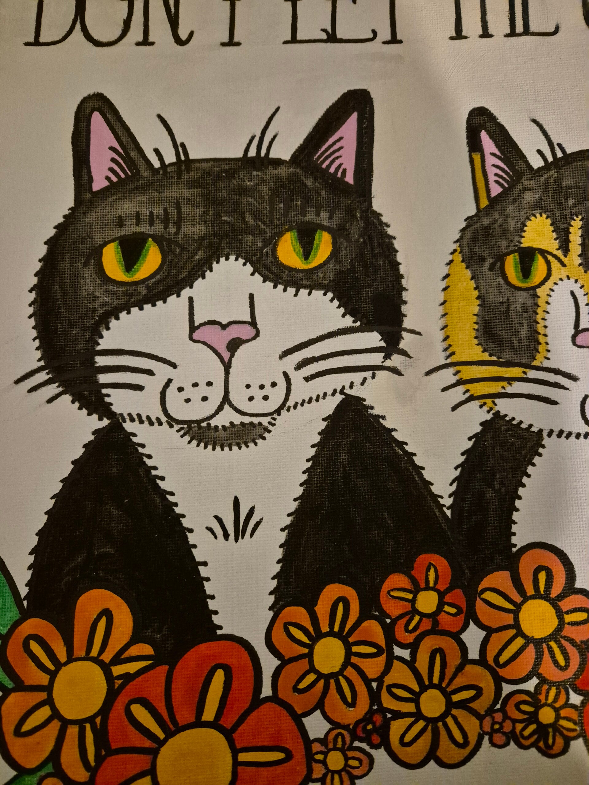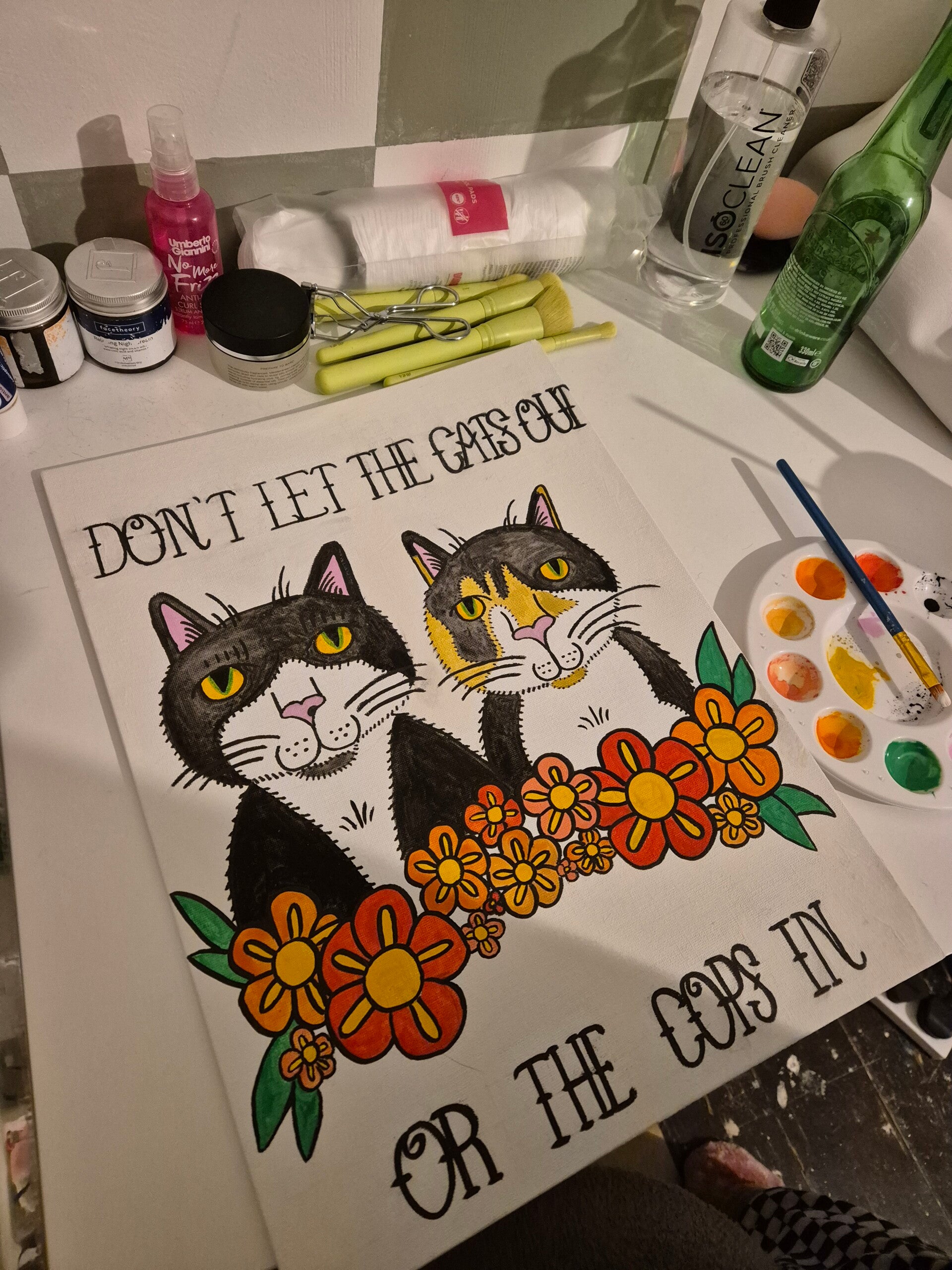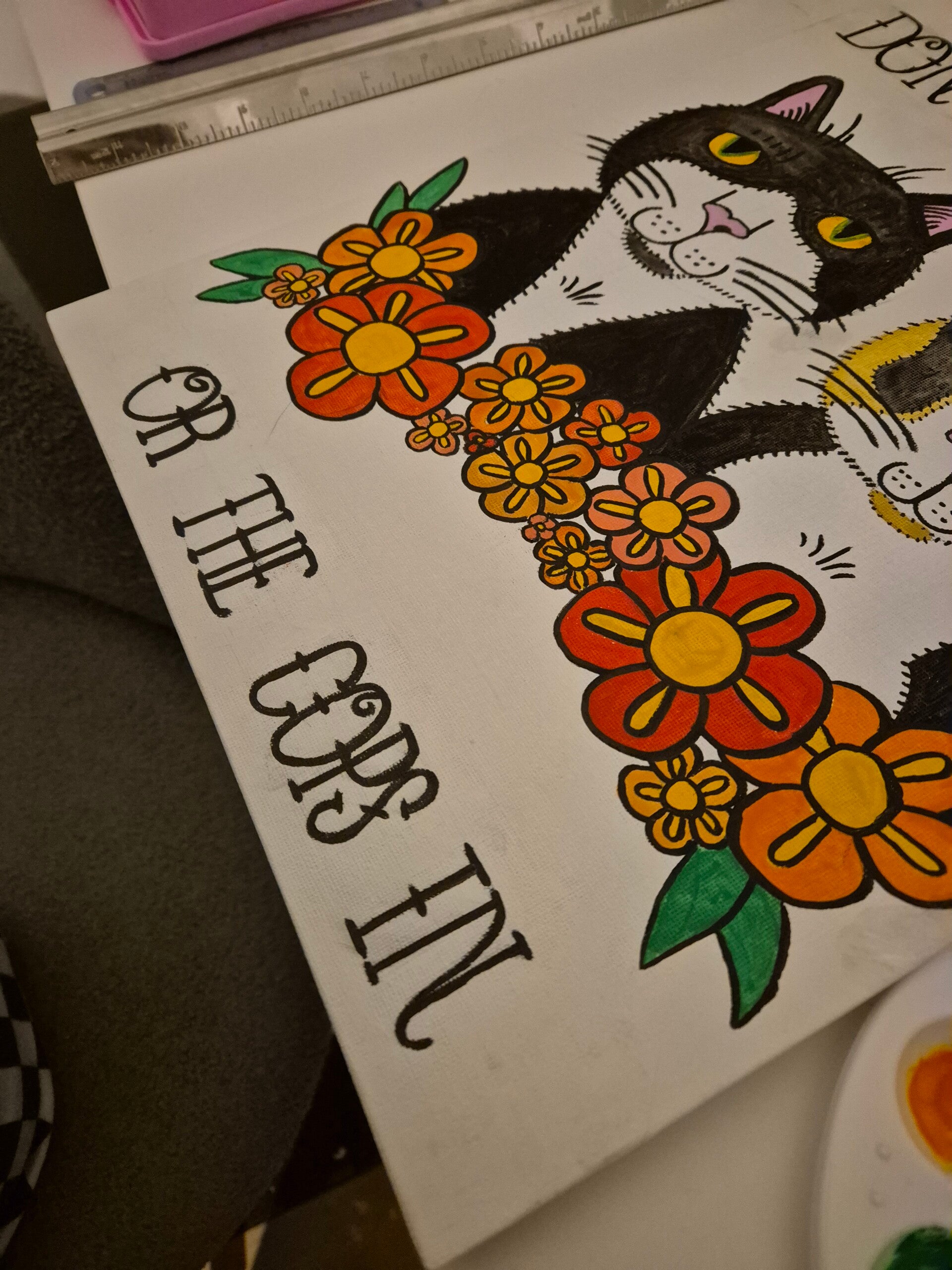 I also decided that I didn't like the shape of the cats heads and how I'd drawn them, I'd slightly shifted this from how I'd drawn them in my sketchbook. I've debated drawing them again, but I might maybe scan in some of my drawings and see what I can do digitally by adding some different flowers.